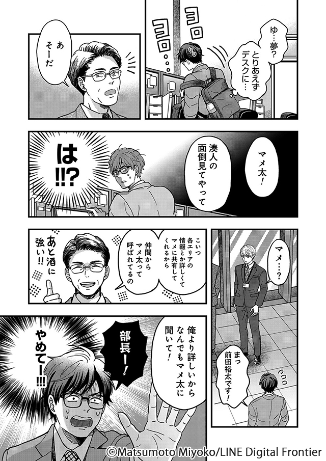前田裕太(マメ太):一途でマメ。営業成績は悪いが、面倒見がよく真面目なので職場では信頼されている。