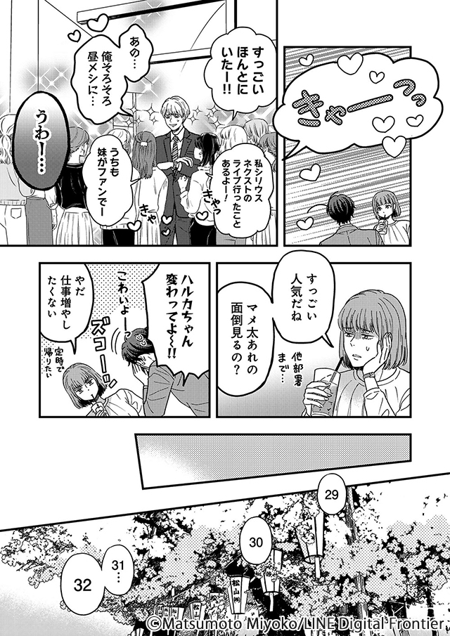 マメ太を励ましたり、カツを入れたりする同僚のハルカちゃんと、碧のアイドル時代の同期の星野(チャラそうだが意外と友達思い)が描いてて楽しかったです。