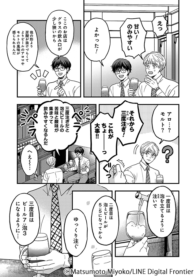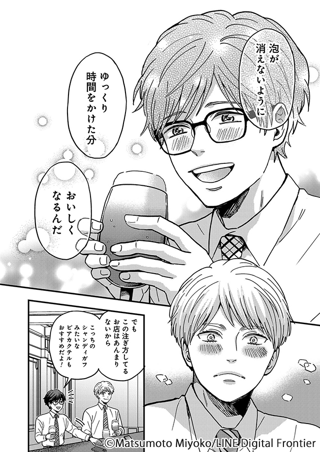 飲料メーカー、しかもビールがメインの営業マンなふたりなので、随所でお酒を飲むシーンがあり、お酒好きの方だと読みながら飲みたくなってしまうかも。(私はネームをチェックしながら、冷たいビールの喉ごしを思い出していました)