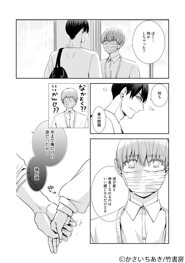 "地雷"だったはずの人付き合いを頑張りはじめた涼の周囲がにぎやかになっていきますが、独占欲が抑えられない藍士に連れ出されてしまう場面も…♡