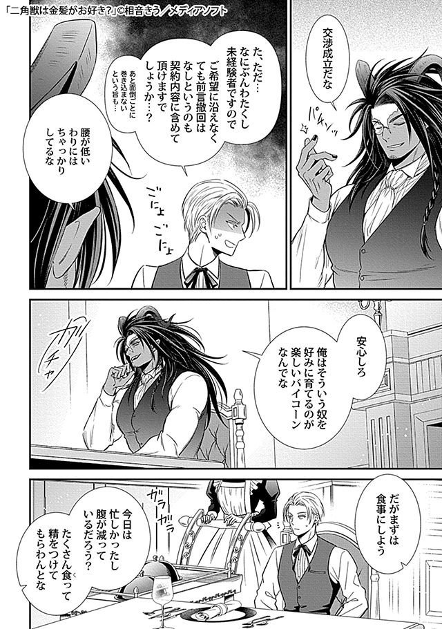 不純を司る「バイコーン族」の商人アランは、金髪の青年がお好き。新人荷運び人・ルークスも美しい金髪の持ち主。しかも長い前髪を上げると、目を奪われるほどの美しい青年だった...!!!アランに気に入られたルークスは、大金と引き換えに毎夜アランを抱く契約を提案されるが、ルークスにはアランに深入りしたくない事情があり...!?