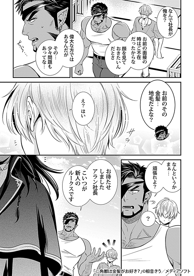 恋愛トラブルに巻き込まれがちな金髪美青年ルークス(攻)と金髪美青年が大好きなバイコーン社長のアラン(受)。社長と荷運び人という関係から始まり、ルークスはアランに気に入られたことで金と引き換えに夜のお相手をすることになったものの、アランの自身に対しての執着にルークスは疑問を持ち始め...というファンタジー世界のお話です。